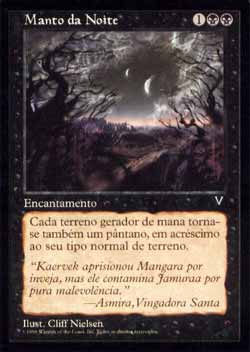 | Nome em Inglês: | Blanket of Night | | Nome em Português: | Manto da Noite | | Custo de Mana: |    | | Tipo: | Encantamento | | Texto: | Cada terreno é um Pântano em adição aos seus outros tipos (aqueles terrenos ganham ' : Adiciona a sua reserva de mana.') Errata: a parte do texto deste card que definia que apenas terrenos produtores de mana seriam transformados em Pântanos foi abolida pela Wizards of the Coast. | | Série: |  | | Raridade: | Incomum | | Card: | 052 |