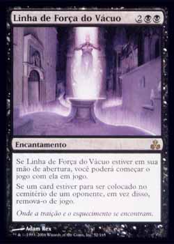 | Nome em Inglês: | Leyline of the Void | | Nome em Português: | Linha de Força do Vácuo | | Custo de Mana: |    | | Tipo: | Encantamento | | Texto: | Se Leyline of the Void estiver em sua mão inicial, você pode começar o jogo com Leyline of the Void no Campo de Batalha. Se um card fosse ser colocado no cemitério de um oponente, Exile-o ao invés. | | Série: |  | | Outras: | | | Raridade: | Raro | | Card: | 052 |