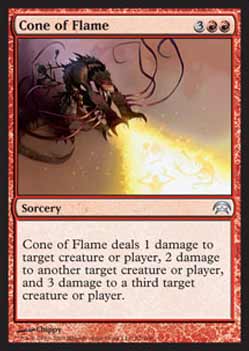 | Nome em Inglês: | Cone of Flame | | Nome em Português: | Sem nome em Português | | Custo de Mana: |    | | Tipo: | Feitiço | | Texto: | Cone of Flame causa 1 ponto de dano à criatura ou ao jogador alvo, 2 pontos de dano a outra criatura ou jogador alvo, e 3 pontos de dano a uma terceira criatura ou jogador alvo. | | Série: |  | | Outras: | | | Raridade: | Incomum | | Card: | 052 |