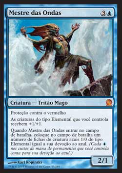 | Nome em Inglês: | Master of Waves | | Nome em Português: | Mestre das Ondas | | Custo de Mana: |   | | Tipo: | Criatura - Tritão Mago | | Texto: | Proteção contra o vermelho. As criaturas do tipo Elemental que você controla ganham +1/+1. Quando Master of Waves entrar no Campo de Batalha, coloque no Campo de Batalha um número de fichas de criatura azul 1/0 do tipo Elemental igual a sua Devoção ao azul. | | P/T: | 2/1 | | Série: |  | | Raridade: | Mítico Raro | | Card: | 053 |