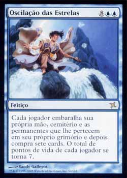 | Nome em Inglês: | Sway of the Stars | | Nome em Português: | Oscilação das Estrelas | | Custo de Mana: |    | | Tipo: | Feitiço | | Texto: | Cada jogador embaralha sua própria mão, cemitério e Permanentes que possua em seu próprio grimório, e então compra sete cards. O total de pontos de vida de cada jogador torna-se 7. | | Série: |  | | Raridade: | Raro | | Card: | 054 |