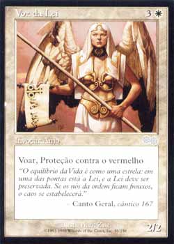 | Nome em Inglês: | Voice of Law | | Nome em Português: | Voz da Lei | | Custo de Mana: |   | | Tipo: | Criatura - Anjo | | Texto: | Voar, Proteção contra o vermelho. | | P/T: | 2/2 | | Série: |  | | Raridade: | Incomum | | Card: | 055 |