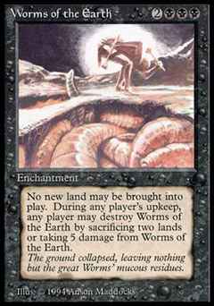 | Nome em Inglês: | Worms of the Earth | | Nome em Português: | Sem nome em Português | | Custo de Mana: |     | | Tipo: | Encantamento | | Texto: | Os jogadores não podem jogar terrenos. Se um terreno fosse entrar no Campo de Batalha, ele não entra no Campo de Batalha. No início da Etapa de Manutenção de cada jogador, qualquer jogador pode sacrificar dois terrenos ou pagar 5 pontos de vida. Se um jogador o fizer, sacrifique Worms of the Earth. | | Série: |  | | Raridade: | Raro | | Card: | 056 |