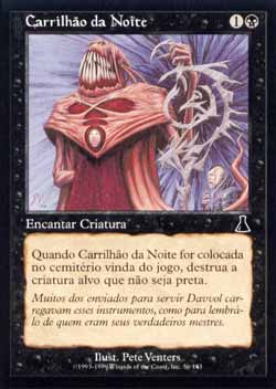 | Nome em Inglês: | Chime of Night | | Nome em Português: | Carrilhão da Noite | | Custo de Mana: |   | | Tipo: | Encantamento - Aura | | Texto: | Encantar criatura. Quando Chime of Night for colocado em um cemitério vindo do Campo de Batalha, destrói a criatura alvo que não seja preta. | | Série: |  | | Raridade: | Comum | | Card: | 056 |