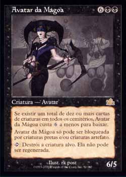 | Nome em Inglês: | Avatar of Woe | | Nome em Português: | Avatar da Mágoa | | Custo de Mana: |    | | Tipo: | Criatura - Avatar | | Texto: | Amedrontar. Se houver um total de dez ou mais cards de criatura em todos os cemitérios, Avatar of Woe custa a menos para ser Conjurado.