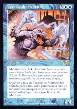 | Nome em Inglês: | Weaver of Lies | | Nome em Português: | Tecelão de Mentiras | | Custo de Mana: |    | | Tipo: | Criatura - Besta | | Texto: | Metamorfose  . Quando Weaver of Lies for virado de face para cima, vire de face para baixo qualquer número de criaturas alvo com Metamorfose que não sejam Weaver of Lies. | | P/T: | 4/4 | | Série: |  | | Raridade: | Raro | | Card: | 057 |