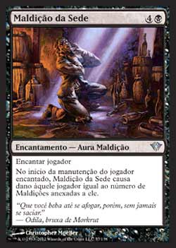 | Nome em Inglês: | Curse of Thirst | | Nome em Português: | Maldição da Sede | | Custo de Mana: |   | | Tipo: | Encantamento - Aura Maldição | | Texto: | Encantar jogador. No início da Etapa de Manutenção do jogador encantado, Curse of Thirst causa uma quantidade de pontos de dano àquele jogador igual ao número de Maldições anexadas a ele. | | Série: |  | | Raridade: | Incomum | | Card: | 057 |