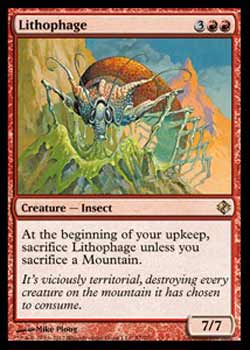 | Nome em Inglês: | Lithophage | | Nome em Português: | Sem nome em Português | | Custo de Mana: |    | | Tipo: | Criatura - Inseto | | Texto: | No início de sua Etapa de Manutenção, sacrifique Lithophage a menos que você sacrifique uma Montanha. | | P/T: | 7/7 | | Série: |  | | Outras: | | | Raridade: | Raro | | Card: | 057 |