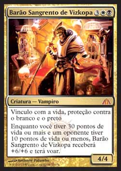 | Nome em Inglês: | Blood Baron of Vizkopa | | Nome em Português: | Barão Sangrento de Vizkopa | | Custo de Mana: |    | | Tipo: | Criatura - Vampiro | | Texto: | Vínculo com a Vida, Proteção contra o branco, Proteção contra o preto. Enquanto você tiver 30 ou mais pontos de vida e um oponente tiver 10 ou menos pontos de vida, Blood Baron of Vizkopa ganha +6/+6 e tem Voar. | | P/T: | 4/4 | | Série: |  | | Raridade: | Mítico Raro | | Card: | 057 |