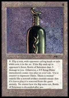 | Nome em Inglês: | Bottle of Suleiman | | Nome em Português: | Sem nome em Português | | Custo de Mana: |  | | Tipo: | Artefato | | Texto: | , sacrifique Bottle of Suleiman: Lance uma moeda. Se você perder, Bottle of Suleiman causa 5 pontos de dano a você. Se você vencer, coloque no Campo de Batalha uma ficha de criatura artefato incolor 5/5 do tipo Gênio com Voar. | | Série: |  | | Outras: | | | Raridade: | Raro | | Card: | 058 |
