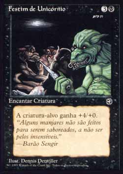 | Nome em Inglês: | Feast of the Unicorn | | Nome em Português: | Festim de Unicórnio | | Custo de Mana: |   | | Tipo: | Encantamento - Aura | | Texto: | Encantar criatura. A criatura encantada ganha +4/+0. | | Série: |  | | Outras: | | | Raridade: | Comum | | Card: | 059 |