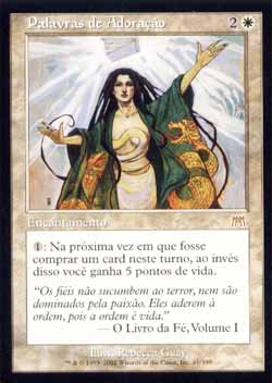 | Nome em Inglês: | Words of Worship | | Nome em Português: | Palavras de Adoração | | Custo de Mana: |   | | Tipo: | Encantamento | | Texto: | : A próxima vez que você fosse comprar um card durante este turno, você ganha 5 pontos de vida ao invés. | | Série: |  | | Raridade: | Raro | | Card: | 061 |