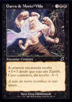 | Nome em Inglês: | Clutch of Undeath | | Nome em Português: | Garra de Morte-Vida | | Custo de Mana: |    | | Tipo: | Encantamento - Aura | | Texto: | Encantar criatura. A criatura encantada ganha +3/+3 enquanto for um Zumbi. Caso contrário, ela ganha -3/-3. | | Série: |  | | Raridade: | Comum | | Card: | 061 |