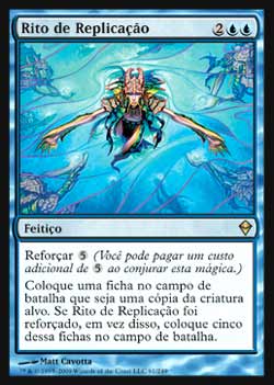 | Nome em Inglês: | Rite of Replication | | Nome em Português: | Rito de Replicação | | Custo de Mana: |    | | Tipo: | Feitiço | | Texto: | Reforçar . Coloque no Campo de Batalha uma ficha de criatura que é uma cópia da criatura alvo. Se Rite of Replication foi Reforçado, coloque no Campo de Batalha cinco fichas de criatura que são cópias da criatura alvo, ao invés. | | Série: |  | | Raridade: | Raro | | Card: | 061 |