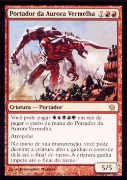 | Nome em Inglês: | Bringer of the Red Dawn | | Nome em Português: | Portador da Aurora Vermelha | | Custo de Mana: |    | | Tipo: | Criatura - Portador (1) | | Texto: | Você pode pagar     em vez de pagar o custo de mana de Bringer of the Red Dawn. Atropelar. No início de sua Etapa de Manutenção, desvire a criatura alvo e você ganha o controla dela até o final do turno. Aquela criatura tem Ímpeto até o final do turno. | | P/T: | 5/5 | | Série: |  | | Raridade: | Raro | | Card: | 062 |