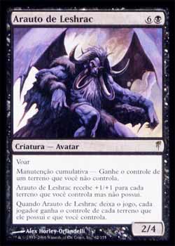 | Nome em Inglês: | Herald of Leshrac | | Nome em Português: | Arauto de Leshrac | | Custo de Mana: |   | | Tipo: | Criatura - Avatar | | Texto: | Voar. Manutenção Cumulativa - Você ganha o controle de um terreno que você não controle. Herald of Leshrac ganha +1/+1 para cada terreno que você controlar mas não possuir. Quando Herald of Leshrac deixar o Campo de Batalha, cada jogador ganha o controle de cada terreno que ele próprio possua e que seja controlado por você. | | P/T: | 2/4 | | Série: |  | | Raridade: | Raro | | Card: | 062 |
