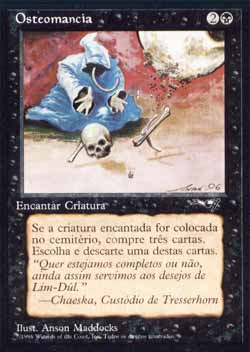 | Nome em Inglês: | Casting of Bones | | Nome em Português: | Osteomancia | | Custo de Mana: |   | | Tipo: | Encantamento - Aura | | Texto: | Encantar criatura. Quando a criatura encantada Morrer, compre três cards, então descarte um destes cards. Tanto este card quanto o card Skeletal Scrying, da série Odisséia, foram traduzidos para o português como Osteomancia. | | Série: |  | | Outras: | | | Raridade: | Comum | | Card: | 064 |