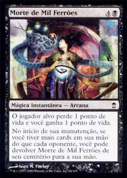 | Nome em Inglês: | Death of a Thousand Stings | | Nome em Português: | Morte de Mil Ferrões | | Custo de Mana: |   | | Tipo: | Mágica Instantânea - Arcana | | Texto: | O jogador alvo perde 1 ponto de vida e você ganha 1 ponto de vida. No início de sua Etapa de Manutenção, se você tiver mais cards em sua mão do que cada oponente, você pode retornar Death of a Thousand Stings de seu cemitério para sua mão. | | Série: |  | | Raridade: | Comum | | Card: | 064 |