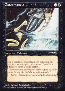 | Nome em Inglês: | Casting of Bones | | Nome em Português: | Osteomancia | | Custo de Mana: |   | | Tipo: | Encantamento - Aura | | Texto: | Encantar criatura. Quando a criatura encantada Morrer, compre três cards, então descarte um destes cards. Tanto este card quanto o card Skeletal Scrying, da série Odisséia, foram traduzidos para o português como Osteomancia. | | Série: |  | | Outras: | | | Raridade: | Comum | | Card: | 065 |
