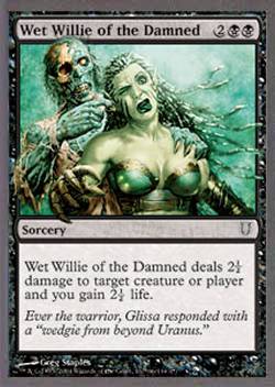 | Nome em Inglês: | Wet Willie of the Damned | | Nome em Português: | Sem nome em Português | | Custo de Mana: |    | | Tipo: | Feitiço | | Texto: | Wet Willie of the Damned causa 2 pontos de dano e meio à criatura ou ao jogador alvo e você ganha 2 dois pontos de vida e meio. | | Série: |  | | Raridade: | Comum | | Card: | 066 |