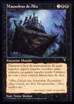 | Nome em Inglês: | Pillar Tombs of Aku | | Nome em Português: | Mausoléus de Aku | | Custo de Mana: |    | | Tipo: | Encantar Mundo | | Texto: | No início da Etapa de Manutenção de cada jogador, aquele jogador pode sacrificar uma criatura. Se aquele jogador não o fizer, aquele jogador perde 5 pontos de vida e você sacrifica Pillar Tombs of Aku. | | Série: |  | | Raridade: | Raro | | Card: | 067 |