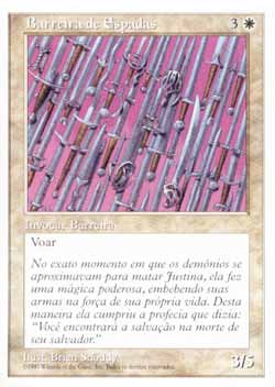 | Nome em Inglês: | Wall of Swords | | Nome em Português: | Barreira de Espadas | | Custo de Mana: |   | | Tipo: | Criatura - Barreira | | Texto: | Defensor, Voar. | | P/T: | 3/5 | | Série: |  | | Outras: | | | Raridade: | Incomum | | Card: | 067 |