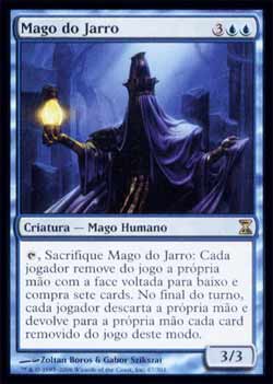 | Nome em Inglês: | Magus of the Jar | | Nome em Português: | Mago do Jarro | | Custo de Mana: |    | | Tipo: | Criatura - Humano Mago | | Texto: | , sacrifique Magus of the Jar: Cada jogador Exila sua própria mão com a face para baixo e compra sete cards. No início da próxima Etapa Final, cada jogador descarta sua própria mão e devolve para sua própria mão cada card Exilado desta forma. | | P/T: | 3/3 | | Série: |  | | Raridade: | Raro | | Card: | 067 |