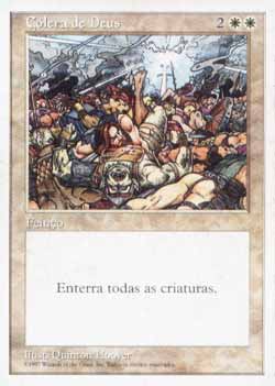 | Nome em Inglês: | Wrath of God | | Nome em Português: | Cólera de Deus | | Custo de Mana: |    | | Tipo: | Feitiço | | Texto: | Destrói todas as criaturas. Elas não podem ser Regeneradas. | | Série: |  | | Outras: | | | Raridade: | Raro | | Card: | 069 |