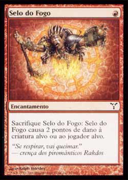 | Nome em Inglês: | Seal of Fire | | Nome em Português: | Selo do Fogo | | Custo de Mana: |  | | Tipo: | Encantamento | | Texto: | Sacrifique Seal of Fire: Seal of Fire causa 2 pontos de dano à criatura ou ao jogador alvo. | | Série: |  | | Outras: | | | Raridade: | Comum | | Card: | 071 |