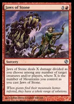 | Nome em Inglês: | Jaws of Stone | | Nome em Português: | Sem nome em Português | | Custo de Mana: |   | | Tipo: | Feitiço | | Texto: | Jaws of Stone causa X pontos de dano divididos da forma como você escolher entre qualquer número de criaturas e/ou jogadores alvo, onde X é o número de Montanhas que você controla conforme você Conjurar Jaws of Stone. | | Série: |  | | Outras: | | | Raridade: | Incomum | | Card: | 072 |