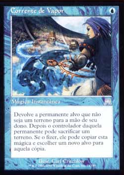 | Nome em Inglês: | Chain of Vapor | | Nome em Português: | Corrente de Vapor | | Custo de Mana: |  | | Tipo: | Mágica Instantânea | | Texto: | Devolva a Permanente alvo que não seja um terreno para a mão de seu dono. Então o controlador daquela Permanente pode sacrificar um terreno. Se aquele jogador o fizer, aquele jogador pode copiar esta mágica e pode escolher um novo alvo para aquela cópia. | | Série: |  | | Raridade: | Incomum | | Card: | 073 |