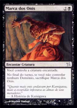 | Nome em Inglês: | Mark of the Oni | | Nome em Português: | Marca dos Onis | | Custo de Mana: |   | | Tipo: | Encantamento - Aura | | Texto: | Encantar criatura. Você controla a criatura encantada. No início da próxima Etapa Final, se você não controlar nenhum Demônio, sacrifique Mark of the Oni. | | Série: |  | | Raridade: | Incomum | | Card: | 073 |
