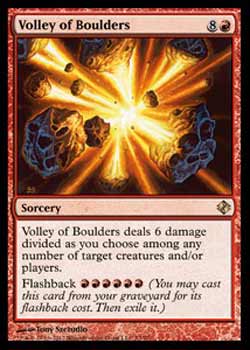 | Nome em Inglês: | Volley of Boulders | | Nome em Português: | Sem nome em Português | | Custo de Mana: |   | | Tipo: | Feitiço | | Texto: | Volley of Boulders causa 6 pontos de dano divididos da forma como você escolher entre qualquer número de criaturas alvo e/ou jogadores alvo. Recapitular      . | | Série: |  | | Outras: | | | Raridade: | Raro | | Card: | 073 |