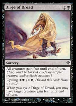 | Nome em Inglês: | Dirge of Dread | | Nome em Português: | Sem nome em Português | | Custo de Mana: |   | | Tipo: | Feitiço | | Texto: | Todas as criaturas têm Amedrontar até o final do turno. Reciclar  . Quando você Reciclar Dirge of Dread, você pode fazer com que uma criatura alvo ganhe Amedrontar até o final do turno. | | Série: |  | | Outras: | | | Raridade: | Comum | | Card: | 073 |
