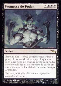 | Nome em Inglês: | Promise of Power | | Nome em Português: | Promessa de Poder | | Custo de Mana: |     | | Tipo: | Feitiço | | Texto: | Escolha uma - você compra cinco cards e perde 5 pontos de vida; ou coloque no Campo de Batalha uma ficha de criatura preta do tipo Demônio com Voar com poder e resistência ambos iguais ao número de cards que houver em sua mão conforme a ficha entra no Campo de Batalha. Entrelaçar . | | Série: |  | | Outras: | | | Raridade: | Raro | | Card: | 074 |