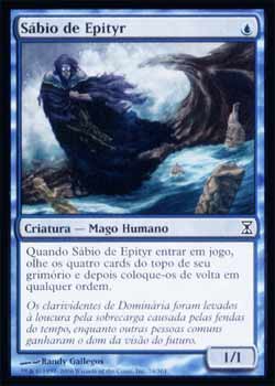 | Nome em Inglês: | Sage of Epityr | | Nome em Português: | Sábio de Epityr | | Custo de Mana: |  | | Tipo: | Criatura - Humano Mago | | Texto: | Quando Sage of Epityr entrar no Campo de Batalha, olhe os quatro cards do topo de seu grimório, então coloque-os de volta em qualquer ordem. | | P/T: | 1/1 | | Série: |  | | Raridade: | Comum | | Card: | 074 |
