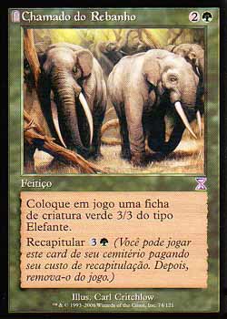 | Nome em Inglês: | Call of the Herd | | Nome em Português: | Chamado do Rebanho | | Custo de Mana: |   | | Tipo: | Feitiço | | Texto: | Coloque no Campo de Batalha uma ficha de criatura verde 3/3 do tipo Elefante. Recapitular  . | | Série: |  | | Outras: | | | Raridade: | Card Desviado no Tempo | | Card: | 074 |