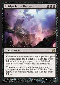 | Nome em Inglês: | Bridge from Below | | Nome em Português: | Sem nome em Português | | Custo de Mana: |    | | Tipo: | Encantamento | | Texto: | Toda vez que uma criatura que não seja uma ficha for colocada em seu cemitério vinda do Campo de Batalha, se Bridge from Below estiver em seu cemitério, coloque no Campo de Batalha uma ficha de criatura preta 2/2 do tipo Zumbi. Toda vez que uma criatura for colocada no cemitério de um oponente vinda do Campo de Batalha, se Bridge from Below estiver em seu cemitério, Exile Bridge from Below. | | Série: |  | | Outras: | | | Raridade: | Raro | | Card: | 074 |