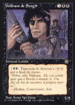 | Nome em Inglês: | Veldrane of Sengir | | Nome em Português: | Veldrane de Sengir | | Custo de Mana: |    | | Tipo: | Criatura Lendária - Humano Ladino | | Texto: |   : Veldrane of Sengir ganha -3/-0 e tem Travessia de Floresta até o final do turno. | | P/T: | 5/5 | | Série: |  | | Raridade: | Raro | | Card: | 075 |
