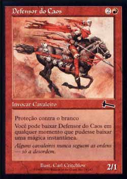 | Nome em Inglês: | Defender of Chaos | | Nome em Português: | Defensor do Caos | | Custo de Mana: |   | | Tipo: | Criatura - Humano Cavaleiro | | Texto: | Lampejo. Proteção contra o branco. | | P/T: | 2/1 | | Série: |  | | Raridade: | Comum | | Card: | 075 |