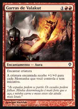 | Nome em Inglês: | Claws of Valakut | | Nome em Português: | Garras de Valakut | | Custo de Mana: |    | | Tipo: | Encantamento - Aura | | Texto: | Encantar criatura. A criatura encantada ganha +1/+0 para cada Montanha que você controla e tem Iniciativa. | | Série: |  | | Outras: | | | Raridade: | Comum | | Card: | 075 |