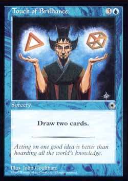 | Nome em Inglês: | Touch of Brilliance | | Nome em Português: | Sem nome em Português | | Custo de Mana: |   | | Tipo: | Feitiço | | Texto: | Compre dois cards. | | Série: |  | | Outras: | | | Raridade: | Comum | | Card: | 076 |