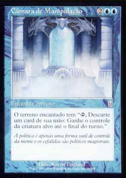 | Nome em Inglês: | Chamber of Manipulation | | Nome em Português: | Câmara de Manipulação | | Custo de Mana: |    | | Tipo: | Encantamento - Aura | | Texto: | Encantar terreno. O terreno encantado tem ' , descarte um card: Você ganha o controle da criatura alvo até o final do turno.' | | Série: |  | | Raridade: | Incomum | | Card: | 076 |