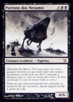 | Nome em Inglês: | Patron of the Nezumi | | Nome em Português: | Patrono dos Nezumis | | Custo de Mana: |    | | Tipo: | Criatura Lendária - Espírito | | Texto: | Oferenda de Rato. Toda vez que uma Permanente for colocada no cemitério de um oponente, aquele jogador perde 1 ponto de vida. | | P/T: | 6/6 | | Série: |  | | Outras: | | | Raridade: | Raro | | Card: | 077 |