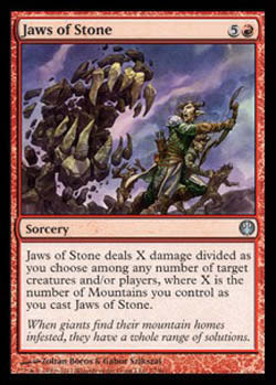 | Nome em Inglês: | Jaws of Stone | | Nome em Português: | Sem nome em Português | | Custo de Mana: |   | | Tipo: | Feitiço | | Texto: | Jaws of Stone causa X pontos de dano divididos da forma como você escolher entre qualquer número de criaturas e/ou jogadores alvo, onde X é o número de Montanhas que você controla conforme você Conjurar Jaws of Stone. | | Série: |  | | Outras: | | | Raridade: | Incomum | | Card: | 077 |