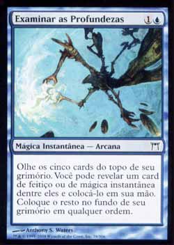 | Nome em Inglês: | Peer Through Depths | | Nome em Português: | Examinar as Profundezas | | Custo de Mana: |   | | Tipo: | Mágica Instantânea - Arcana | | Texto: | Olhe os cinco cards do topo de seu grimório. Você pode revelar um card de Mágica Instantânea ou de feitiço dentre eles e colocá-lo em sua mão. Coloque o restante no fundo de seu grimório em qualquer ordem. | | Série: |  | | Outras: | | | Raridade: | Comum | | Card: | 078 |