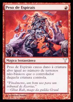 | Nome em Inglês: | Weight of Spires | | Nome em Português: | Peso de Espirais | | Custo de Mana: |  | | Tipo: | Mágica Instantânea | | Texto: | Weight of Spires causa à criatura alvo uma quantidade de pontos de dano igual ao número de terrenos não básicos controlados pelo controlador daquela criatura. | | Série: |  | | Raridade: | Incomum | | Card: | 078 |