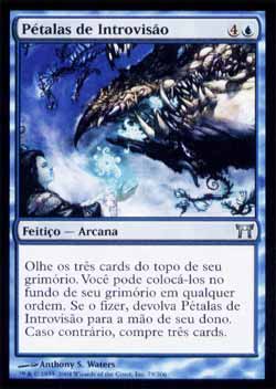 | Nome em Inglês: | Petals of Insight | | Nome em Português: | Pétalas de Introvisão | | Custo de Mana: |   | | Tipo: | Feitiço - Arcana | | Texto: | Olhe os três cards do topo de seu grimório. Você pode colocar estes cards no fundo de seu grimório em qualquer ordem. Se o fizer, devolva Petals of Insight para a mão de seu dono. Se não, compre três cards. | | Série: |  | | Outras: | | | Raridade: | Incomum | | Card: | 079 |