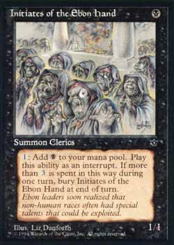 | Nome em Inglês: | Initiates of the Ebon Hand | | Nome em Português: | Sem nome em Português | | Custo de Mana: |  | | Tipo: | Criatura - Clérigo | | Texto: | : Adiciona a sua reserva de mana. Se esta habilidade tiver sido Ativada quatro ou mais vezes durante este turno, sacrifique Initiates of the Ebon Hand no início da próxima Etapa Final. | | P/T: | 1/1 | | Série: |  | | Outras: | | | Raridade: | Comum | | Card: | 082 |