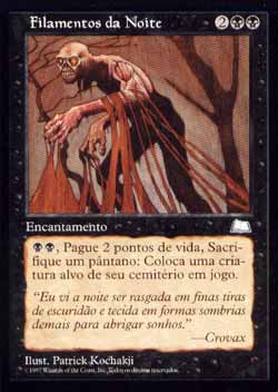 | Nome em Inglês: | Strands of Night | | Nome em Português: | Filamentos da Noite | | Custo de Mana: |    | | Tipo: | Encantamento | | Texto: |  , pague 2 pontos de vida, sacrifique um Pântano: Devolva um card de criatura alvo de seu cemitério para o Campo de Batalha. | | Série: |  | | Outras: | | | Raridade: | Incomum | | Card: | 082 |